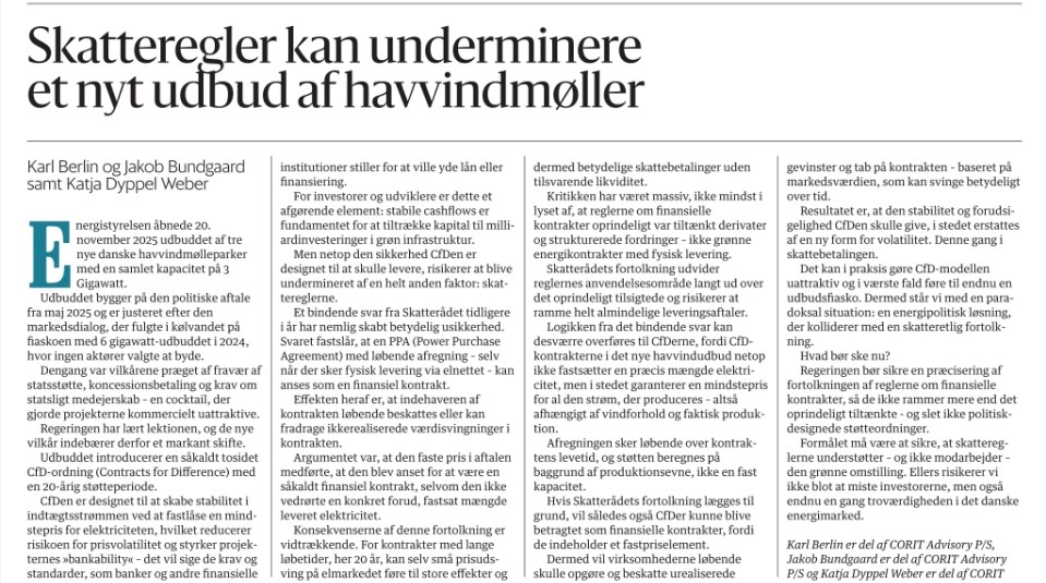 New article by Karl Berlin, Jakob Bundgaard and Katja Dyppel Weber – Skatteregler kan underminere et nyt udbud af havvindmøller