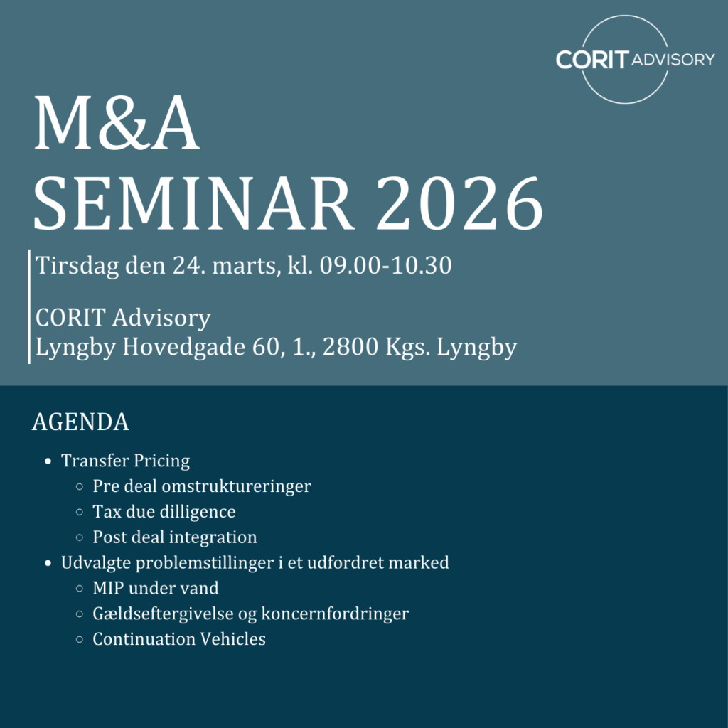 CORIT Advisory har fornøjelsen af at invitere dig til en faglig morgenbriefing, hvor vi sætter fokus på en række aktuelle skatteproblemstillinger af relevans i forbindelse med M&A.